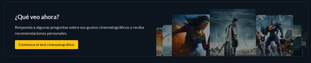 Si no sabes qué ver, la propia web te presenta el «test cinematográfico«. El cuestionario muestra unos contenidos para que selecciones como preferencias; después las plataformas srteaming a las que tienes acceso y por último te enseña aquellos que puedan interesarte.